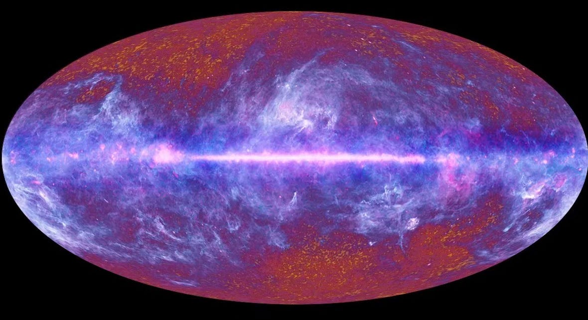 [All-sky image of cosmic microwave background from data collected by the European Space Agency’s Planck satellite showing echoes of the Big Bang left from the dawn of the universe.]